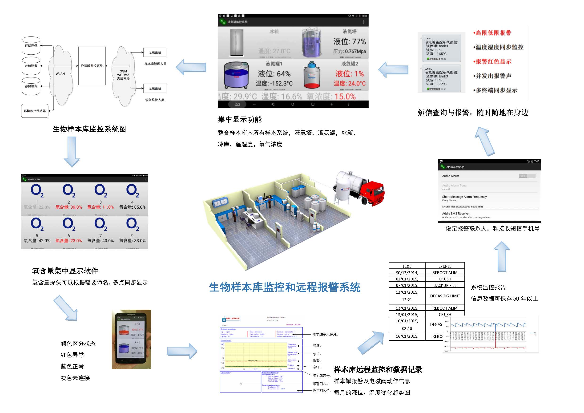 整合样本库内所有样本系统, 液氮塔, 液氮罐, 冰箱,冷库, 温湿度, 氧气浓度