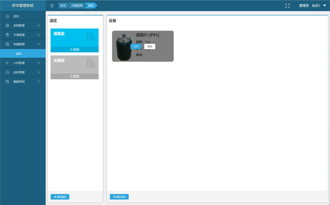 系统支持温区管理,可以将冰箱、液氮罐等存储设备进行分区管理,支持以冻存盒伟单位进行空间划分,支持存储设备和冻存盒空间的自定义编辑。
