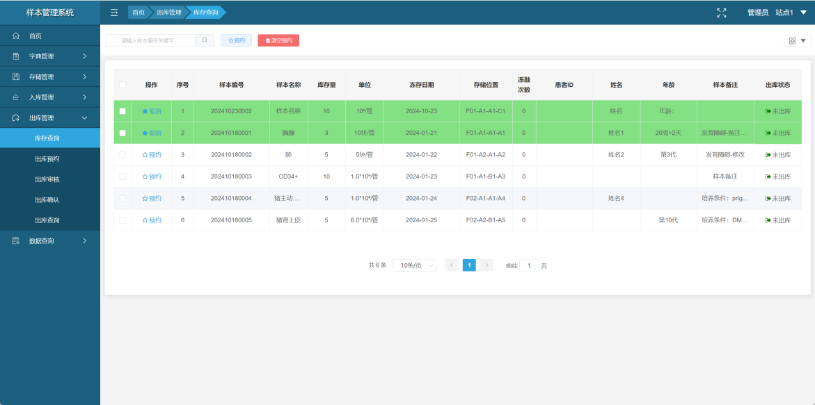 系统支持出库流程管理,可以对库存查询、出库预约、出库确认、出库审核和样本出库等流程环节进行信息记录,支持便捷的样本库存查询功能,可以对多个查询条件的进行配置,从此实现多字段信息查询,系统支持支持人工录入、扫描枪、平板扫描仪等多种形式的样本出库确认方式,通过使用扫描枪和平板扫描仪,可以防止用户拿错样本。